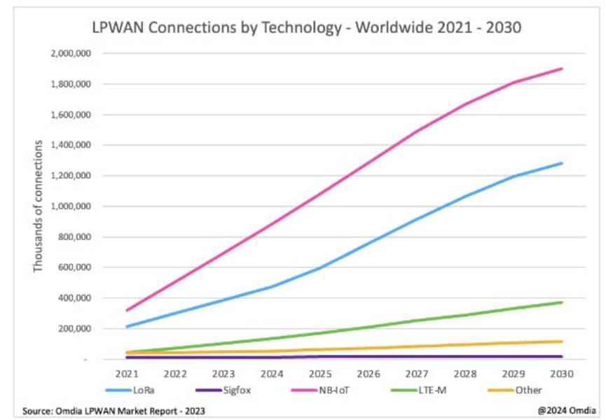 今年6月,市場(chǎng)研究機(jī)構(gòu)發(fā)布報(bào)告顯示,低功耗廣域網(wǎng) (LPWAN) 連接領(lǐng)域以 NB-IoT 和 LoRa 為主導(dǎo),2023 年這兩種技術(shù)合計(jì)占總連接的 87%。這種主導(dǎo)地位將持續(xù)下去,預(yù)計(jì)到 2030 年,這兩種技術(shù)將占據(jù)所有 LPWAN 連接的 86%。