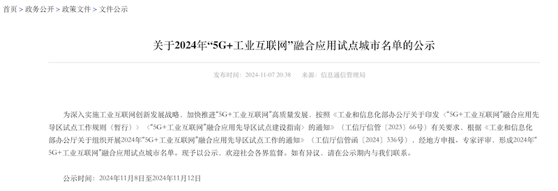 C114訊 11月11日消息(南山)據(jù)工信部官網(wǎng),近日,2024年“5G+工業(yè)互聯(lián)網(wǎng)”融合應(yīng)用試點城市名單正式公示,共10座城市入選。